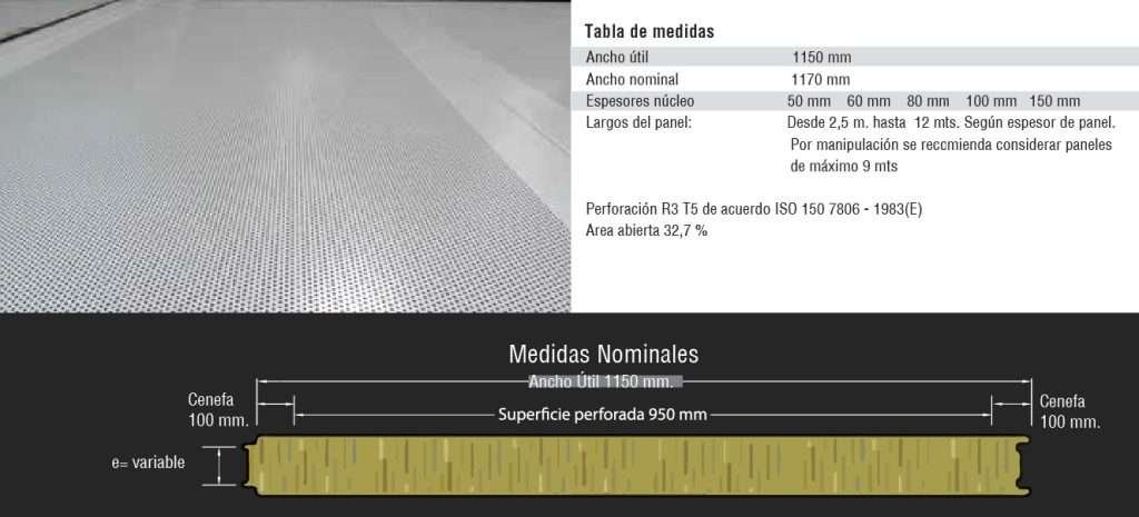Nuestros paneles acústicos están diseñados con un núcleo aislante de lana de roca de alta densidad, lo que les proporciona una excelente absorción acústica. Este núcleo está firmemente adherido entre dos láminas de acero, y su cara inferior cuenta con microperforaciones de 3 mm, lo que optimiza aún más la absorción del sonido. Además, el panel está protegido por un velo de fibra de vidrio, que garantiza la integridad estructural del producto y aumenta su durabilidad.